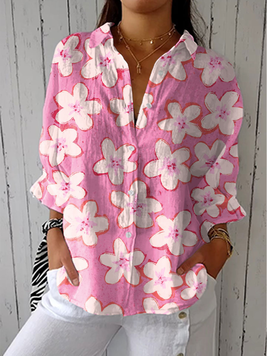 Women's Vintage Floral Art Print Casual Linen V-neck Shirt