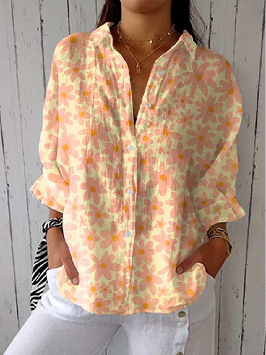 Women's Vintage Floral Art Print Casual Linen V-neck Shirt