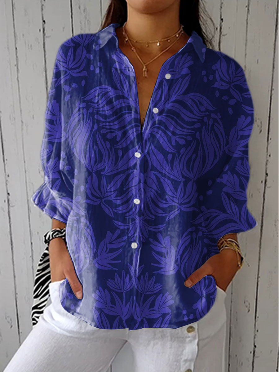 Women's Vintage Floral Art Print Casual Linen V-neck Shirt