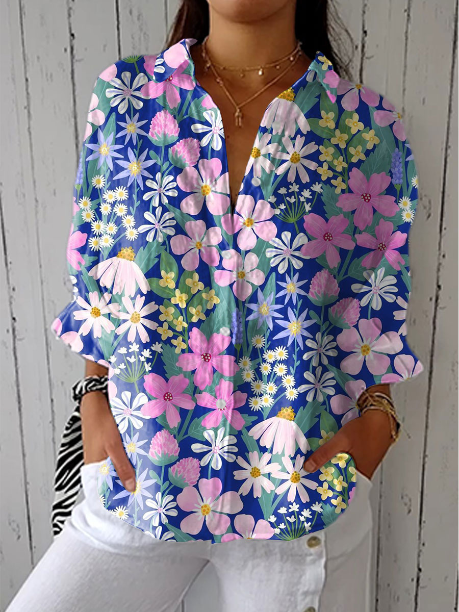 Women's Vintage Floral Art Print Casual Linen V-neck Shirt