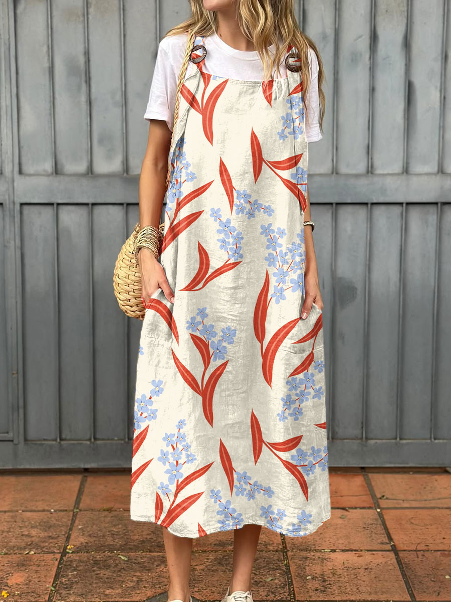 Women's Vintage Floral Art Print Cotton Pocket Suspender Dress