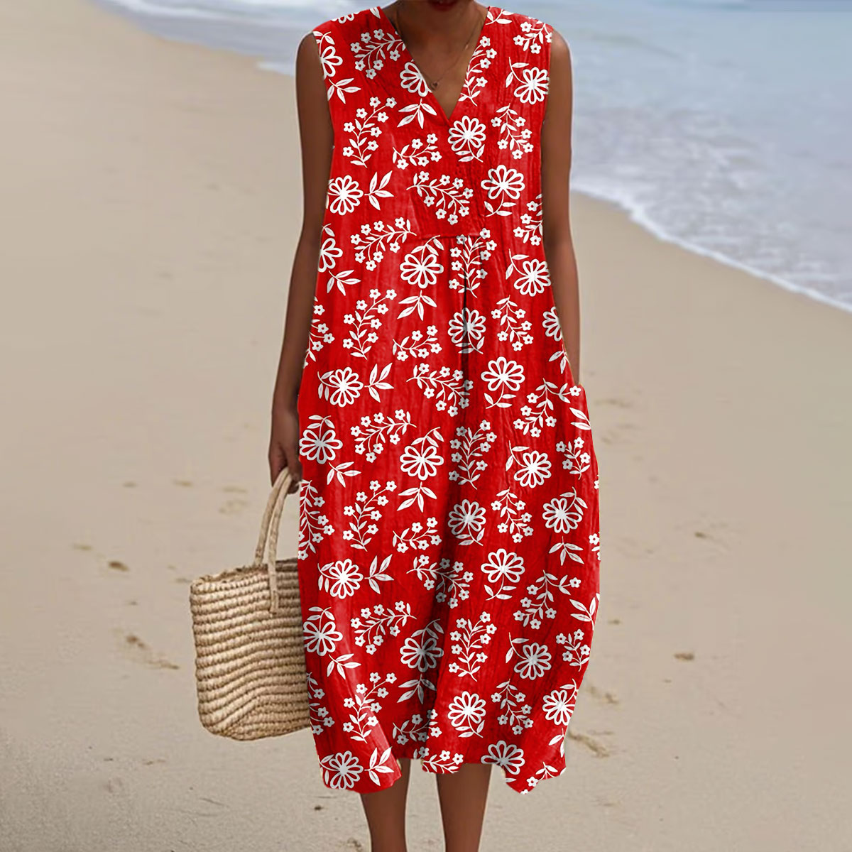 Women's Vintage Floral Art Print Sleeveless Cotton Pocket Wrap V Neck Dress