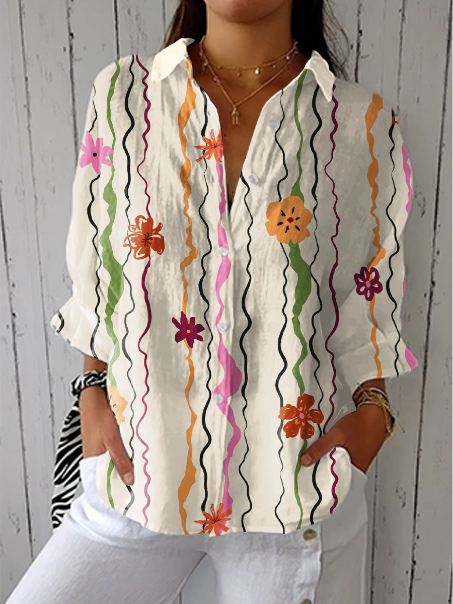 Women's Vintage Flower Art Print Casual Linen V-neck Shirt
